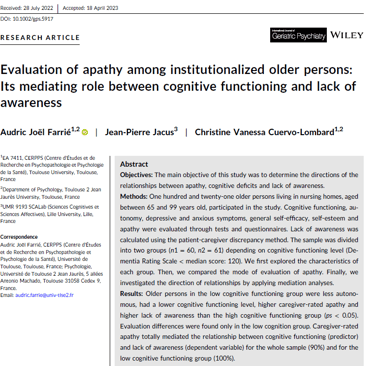 Farrié, A. J., Jacus, J-P., & Cuervo-Lombard, C. V. (2023). Evaluation of apathy among institutionalized older persons: Its mediating role between cognitive functioning and lack of awareness. Int J Geriatr Psychiatry. DOI: 10.1002/gps.5917